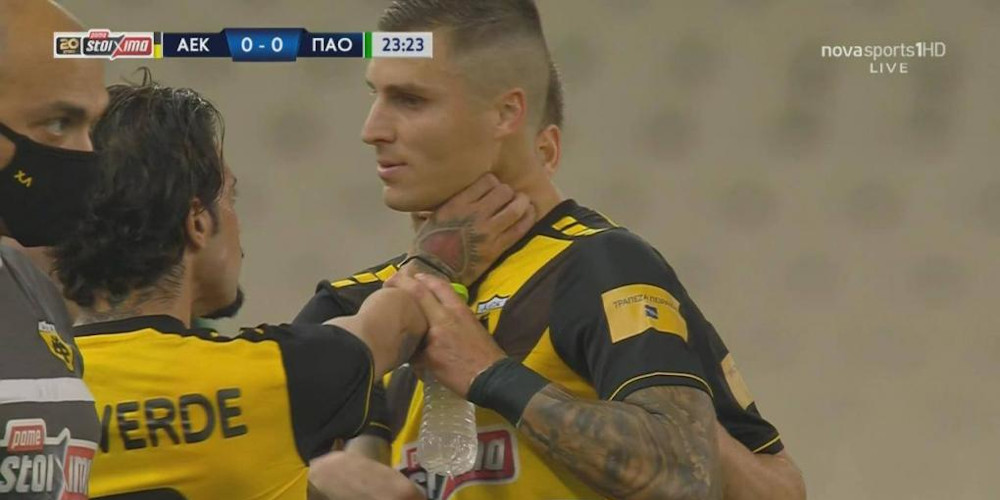 Η ΑΕΚ υποδέχεται αυτή τη στιγμή τον Παναθηναϊκό στο ΟΑΚΑ, σε μια φάση του αγώνα ο Ντανιέλε Βέρντε έπιασε από τον λαιμό τον συμπαίκτη του Όγκνιεν Βράνιες.