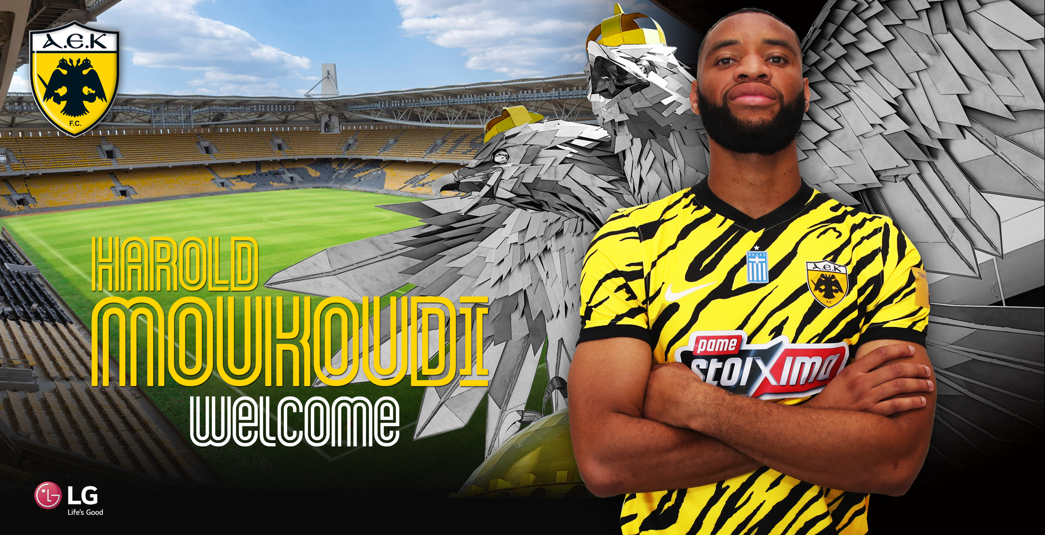 «Η ΠΑΕ ΑΕΚ ανακοινώνει τη μεταγραφή του ποδοσφαιριστή Αρόλντ Μουκουντί από τη γαλλική Σεντ Ετιέν. Ο Καμερουνέζος διεθνής κεντρικός αμυντικός υπέγραψε συμβόλαιο συνεργασίας με την ομάδα μας έως το καλοκαίρι του 2026.