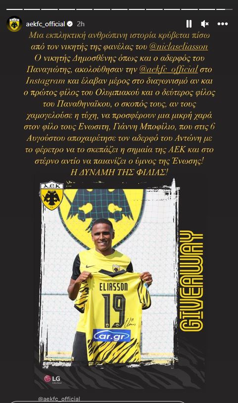 «Μια εκπληκτική ανθρώπινη ιστορία κρύβεται πίσω από τον νικητή της φανέλας του Νίκλας Ελίασον. Ο νικητής Δημοσθένης όπως και ο αδερφός του Παναγιώτης, ακολούθησαν την ΑΕΚ στο Instagram και έλαβαν μέρος στον διαγωνισμό αν και ο πρώτος φίλος του Ολυμπιακού και ο δεύτερος φίλος του Παναθηναϊκού, ο σκοπός τους, αν τους χαμογελούσε η τύχη, να προσφέρουν μια μικρή χαρά στον φίλο τους Ενωσίτη, Γιάννη Μποφίλιο, που στις 6 Αυγούστου αποχαιρέτησε τον αδερφό του Αντώνη με το φέρετρο να το σκεπάζει η σημαία της ΑΕΚ και στο στερνό αντίο να παιανίζει ο ύμνος της Ένωσης! Η ΔΥΝΑΜΗ ΤΗΣ ΦΙΛΙΑΣ!», έγραψε η ΑΕΚ γνωστοποιώντας τη συγκλονιστική ιστορία…