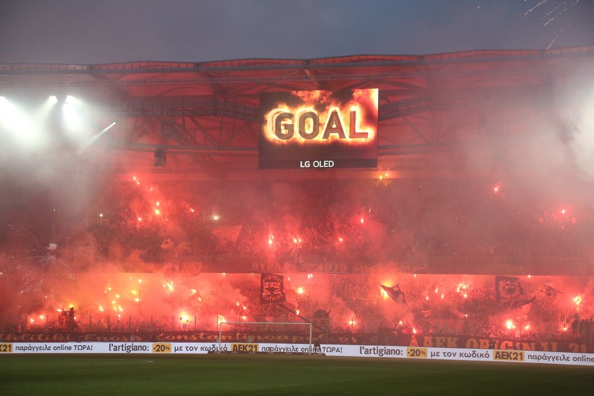 Μία φωτοβολίδα ευθείας βολής εκτοξεύθηκε στο 2ο μέρος από το ένα πέταλο της OPAP Arena στο άλλο, κατά τη διάρκεια της αναμέτρησης της ΑΕΚ με τον Βόλο για την τελευταία αγωνιστική των playoffs στη Super League.