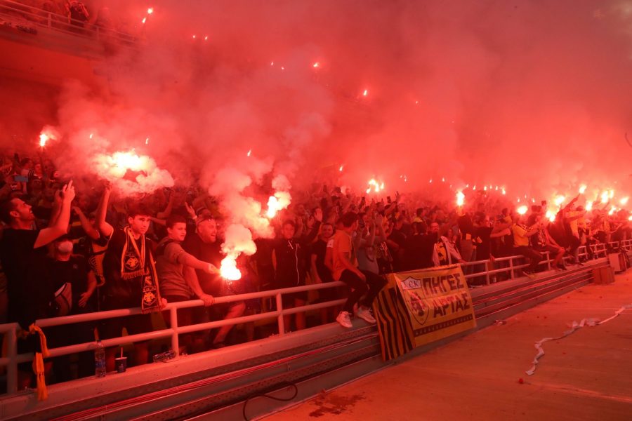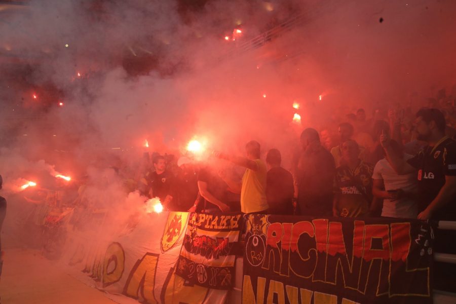 Οι φίλοι της ΑΕΚ δημιούργησαν μια απίστευτη ατμόσφαιρα λίγη ώρα πριν από την έναρξη του αγώνα, κάνοντας τη νύχτα μέρα και έβαλαν «φωτιά» στην «OPAP Arena», ανάβοντας δεκάδες καπνογόνα!