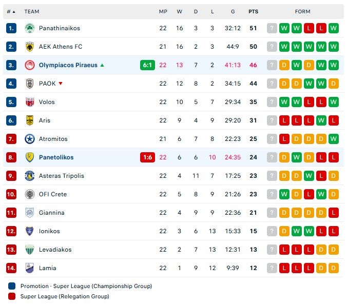 Οι Πειραιώτες έφτασαν τους 46 βαθμούς και είναι μόνοι στην τρίτη θέση της Super League, έχοντας πέντε βαθμούς λιγότερους με τον Παναθηναϊκό και τέσσερις από την ΑΕΚ με παιχνίδι περισσότερο. Αντίθετα ο Παναιτωλικός παρέμεινε στους 24 βαθμούς.