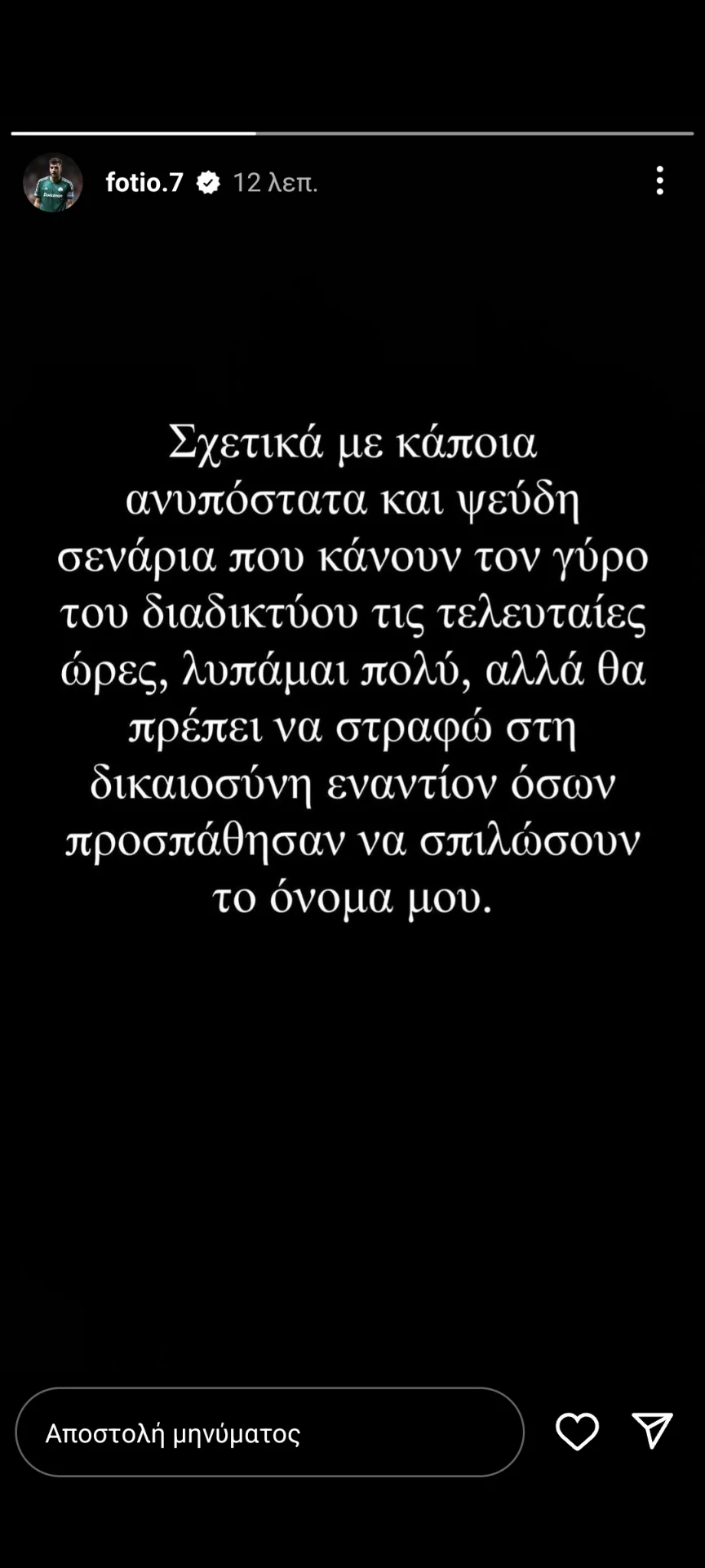 «Σχετικά με κάποια ανυπόστατα και ψευδή σενάρια που κάνουν τον γύρο του διαδικτύου τις τελευταίες ώρες, λυπάμαι πολύ, αλλά θα πρέπει να στραφώ στη δικαιοσύνη εναντίον όσων προσπάθησαν να σπιλώσουν το όνομά μου».