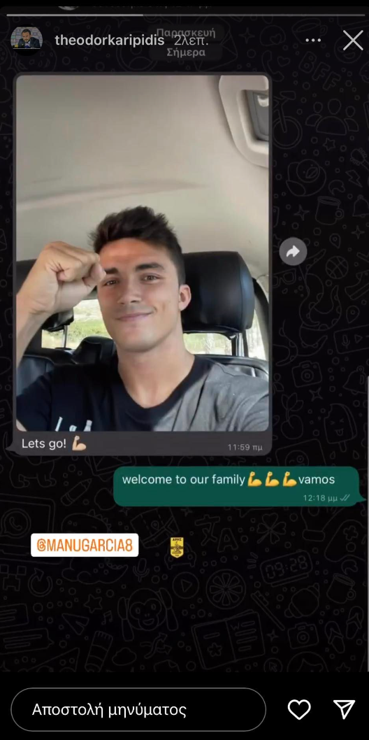 «Καλώς ήρθες στην οικογένειά μας. Πάμε!» ήταν το μήνυμα του Καρυπίδη στον Γκαρθία και τον «τάγκαρε» σε ιστορία του Instagram και δίπλα τοποθέτησε το σήμα του Άρη.