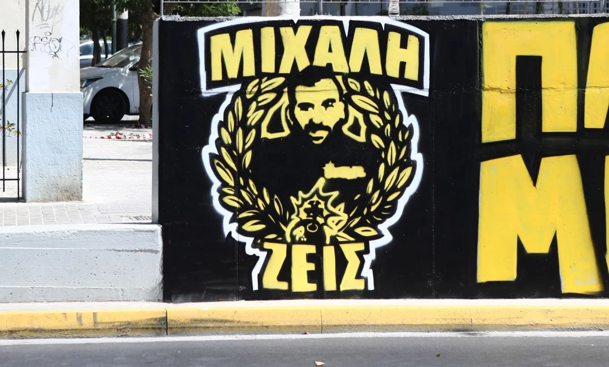 Ένα γκράφιτι στη μνήμη του Μιχάλη Κατσουρή, ο οποίος δολοφονήθηκε από τις ορδές Κροατών χουλιγκάνων και των Ελλήνων συνεργών τους, στα αιματηρά επεισόδια της Νέας Φιλαδελφείας, εμφανίστηκε σήμερα έξω από το γήπεδο της ΑΕΚ.