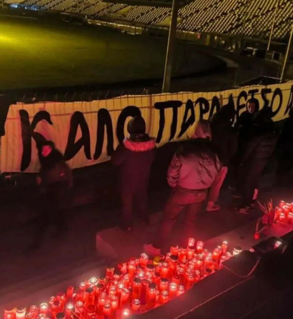 Στα σκαλιά της Θύρας 4, φίλαθλοι του ΠΑΟΚ άναψαν κεριά και στα κάγκελα που συνήθως απλώνουν τα πανό με τα συνθήματα τους, κρέμασαν ένα ολόλευκο που έγραφε με μαύρα γράμματα: «Καλό Παράδεισο Αδέρφια».