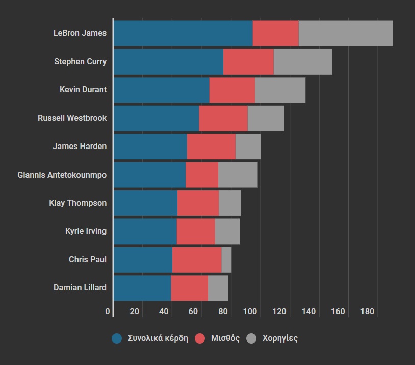 Στα του Chris Paul, ο λόγος που «υπάρχει» o πρόεδρος του σωματείου των NBAers (ΝΒΡΑ) στους πιο ακριβοπληρωμένους της τρέχουσας σεζόν είναι ο μισθός του, με τις χορηγίες να του δίνουν το μικρότερο ποσό όλων των μελών της κορυφαίας δεκάδας (7.000.000 δολάρια). Στα endorsements έχει τους Nike, Panini, Spalding, State Farm και Walt Disney. Tέλος, ο Damian Lillard συνεργάζεται με τους Panini, Adidas και Hulu, ενώ έχει συμμετοχή και στο BOLT24, νέου προϊόντος της Gatorade, ειδικά «σχεδιασμένου» για αθλητές.