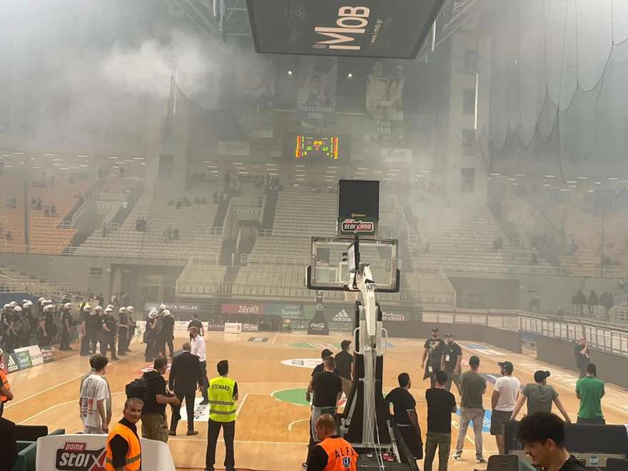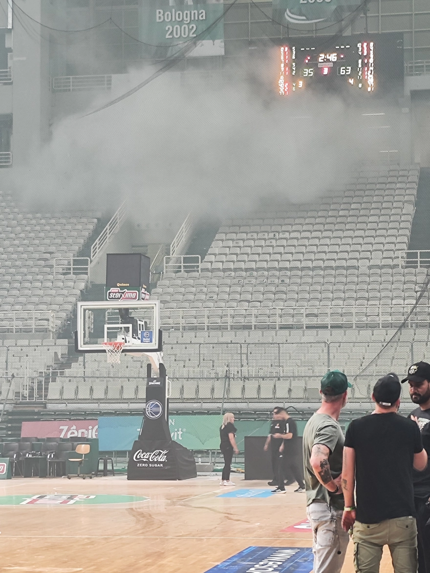 Στο 2.46′ πριν από το φινάλε του 3ου και ενώ το σκορ ήταν 63-35 για τον Ολυμπιακό οι οπαδοί του Παναθηναϊκού άναψαν καπνογόνα και έριξαν φωτοβολίδες.