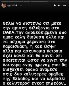 «Θέλω να πιστεύω ότι μετά την άριστη φιλοξενία στο ΟΑΚΑ. Την αποδεδειγμένη από εμάς καλή διάθεση αλλά και τα άσχημα γεγονότα στο Καραϊσκάκη, η ΚΑΕ ΟΣΦΠ αλλά και η Αστυνομία Πειραιά έχει κάνει και θα κάνει ό,τι απαιτείται ώστε να γίνει τη Δευτέρα ένας αγώνας που θα διεξαχθεί ομαλά ανάμεσα στις δύο καλύτερες ομάδες της Ελλάδος και να κερδίσει ο καλύτερος εντός γηπέδου», ανέφερε σε ανάρτησή του ο ιδιοκτήτης της πράσινης ΚΑΕ.