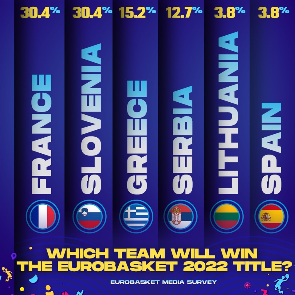 Στην ερώτηση «ποια ομάδα θα κατακτήσει το Eurobasket» η Ελλάδα βρέθηκε στην 3η θέση αλλά με το… δεύτερο καλύτερο ποσοστό των προτιμήσεων. Δηλαδή η Γαλλία και η Σλοβενία μοιράστηκαν την 1η θέση με ποσοστό 30.4% ενώ η Ελλάδα συγκέντρωσε ποσοστό της τάξεως του 15.2%.