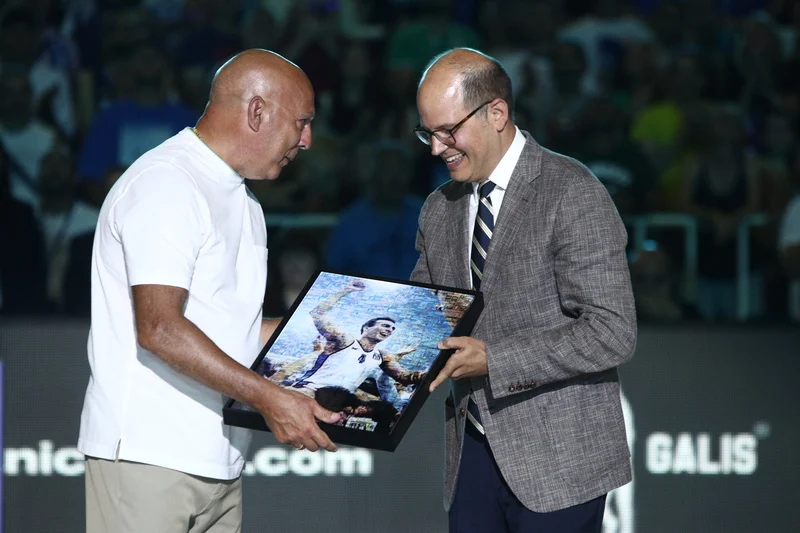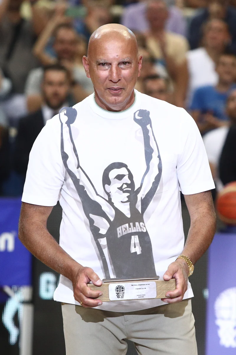 Μετά από ένα εκπληκτικό standing ovation πολλών λεπτών από τον κόσμο που φώναζε ρυθμικά το όνομά του, ο Νίκος Γκάλης βραβεύτηκε κι από τον γ.γ. της FIBA Ανδρέα Ζαγκλή για την προσφορά του στο άθλημα, ενώ ακολούθησε αντίστοιχη βράβευση κι από τον πρόεδρο της ΕΟΚ, Βαγγέλη Λιόλιο.
