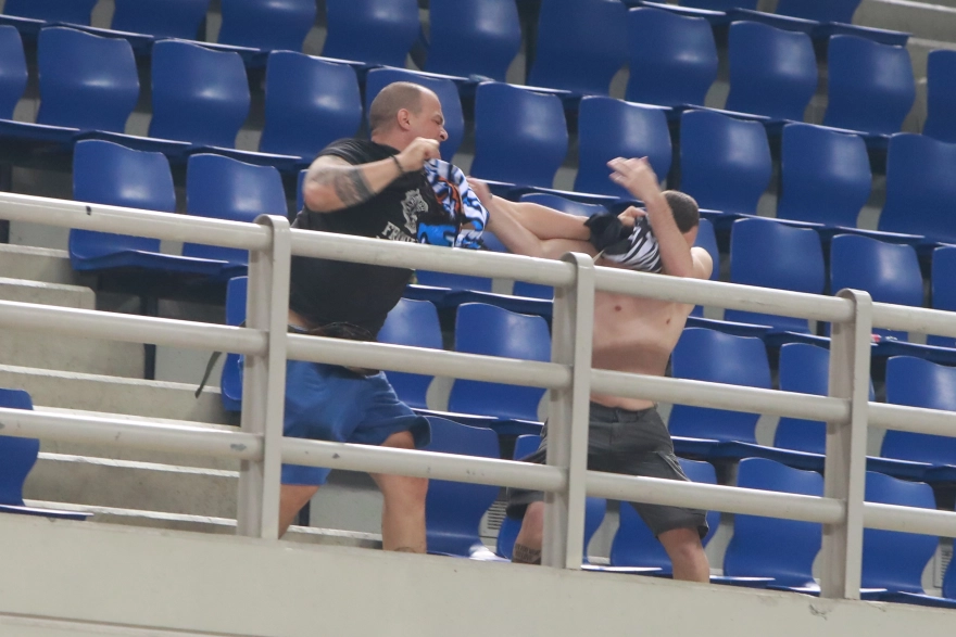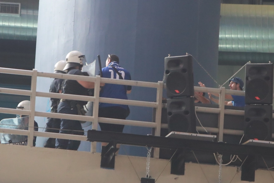 Δημιουργήθηκε ένταση, εκσφενδονίστηκαν μπουκάλια, ωστόσο η παρέμβαση των ΜΑΤ, με χρήση των γκλομπ, οδήγησε τους φιλάθλους στην πλευρά που τους είχε δοθεί από την αρχή το αγώνα.