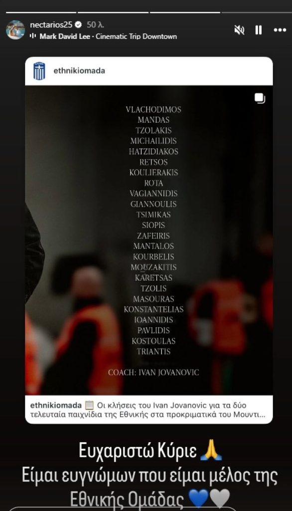Ο 22χρονος αμυντικός μέσος δεν έκρυψε τη συγκίνηση του γι’ αυτήν την εξέλιξη κάνοντας repost την ανακοίνωση της αποστολής και γράφοντας: «Ευχαριστώ Κύριε! Είμαι ευγνώμων που είμαι μέλος της Εθνικής ομάδας».