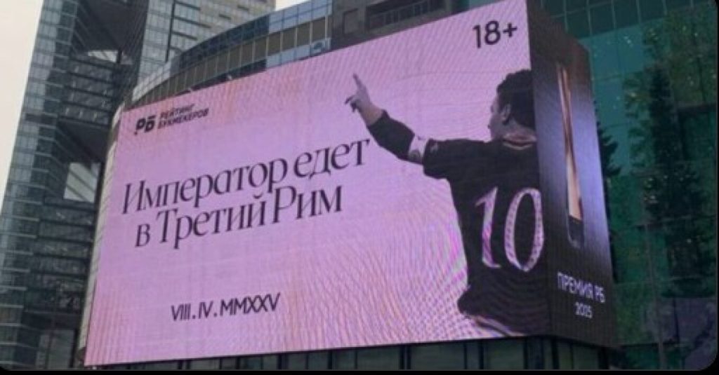 «Ο αυτοκράτορας πηγαίνει στην τρίτη Ρώμη» αναγράφεται στα σχετικά εμπορικά μπάνερ, τα οποία διαφημίζουν την επικείμενη επίσκεψη του Ιταλού πρώην ποδοσφαιριστή στη Μόσχα.