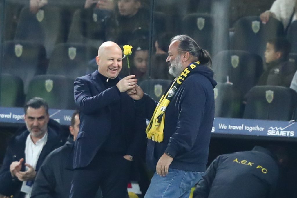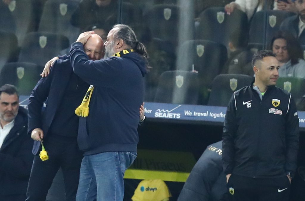 Ξεχωριστή στιγμή αποτέλεσε η κίνησή του να προσφέρει ένα κίτρινο τριαντάφυλλο στον Σέρβο τεχνικό, σε μια συμβολική ένδειξη εκτίμησης, κάτι που δεν συνηθίζει στις εμφανίσεις του μετά τα παιχνίδια, ενώ στη συνέχεια τον ασπάστηκε στο κεφάλι.