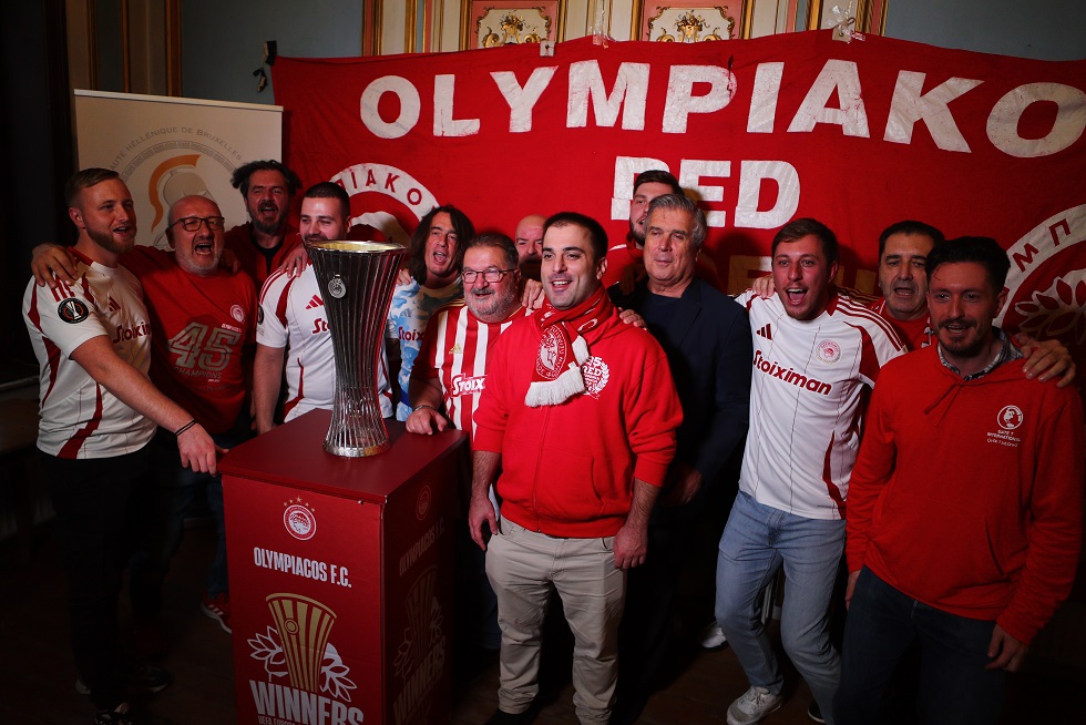 Πλήθος οπαδών του πειραϊκού συλλόγου συγκεντρώθηκε στη βελγική πρωτεύουσα και κατέκλισε την περιοχή της ελληνικής κοινότητας, με τους «ερυθρόλευκους» οπαδούς να βλέπουν από κοντά τα δύο ιστορικά τρόπαια (Europa Conference League και Youth League) που κατέκτησαν οι ομάδες ανδρών και Νέων του Ολυμπιακού αντίστοιχα, την περσινή σεζόν.