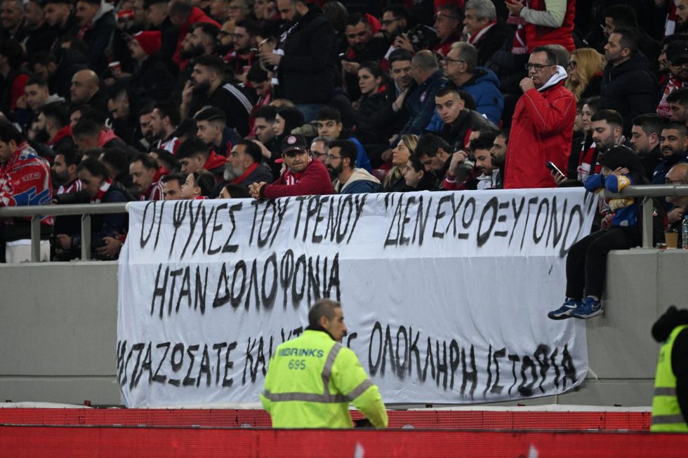 Οι φίλοι του Ολυμπιακού σήκωσαν πανό για το έγκλημα στα Τέμπη (φωτο)
