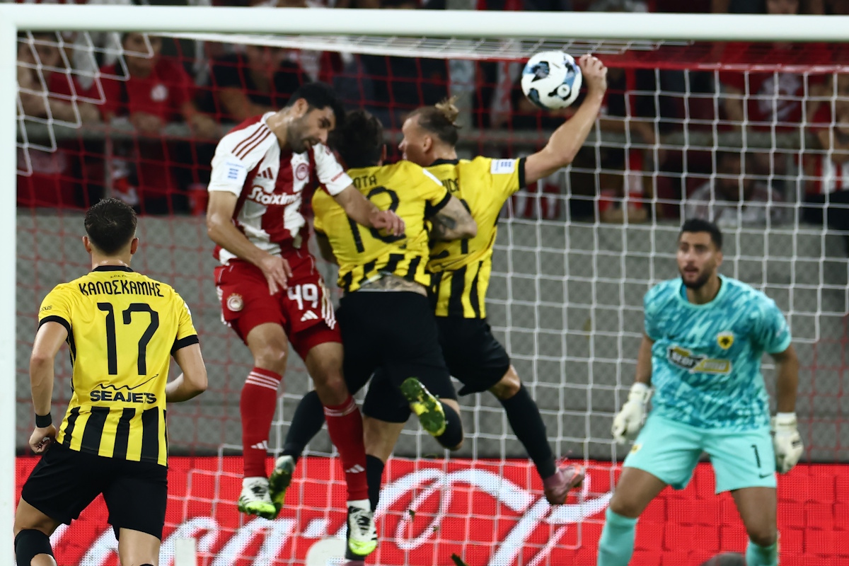 Σέντρα του Κοστίνια από δεξιά, κεφαίά του Ελ Κααμπί, η μπάλα πάνω στον Στρακόσα