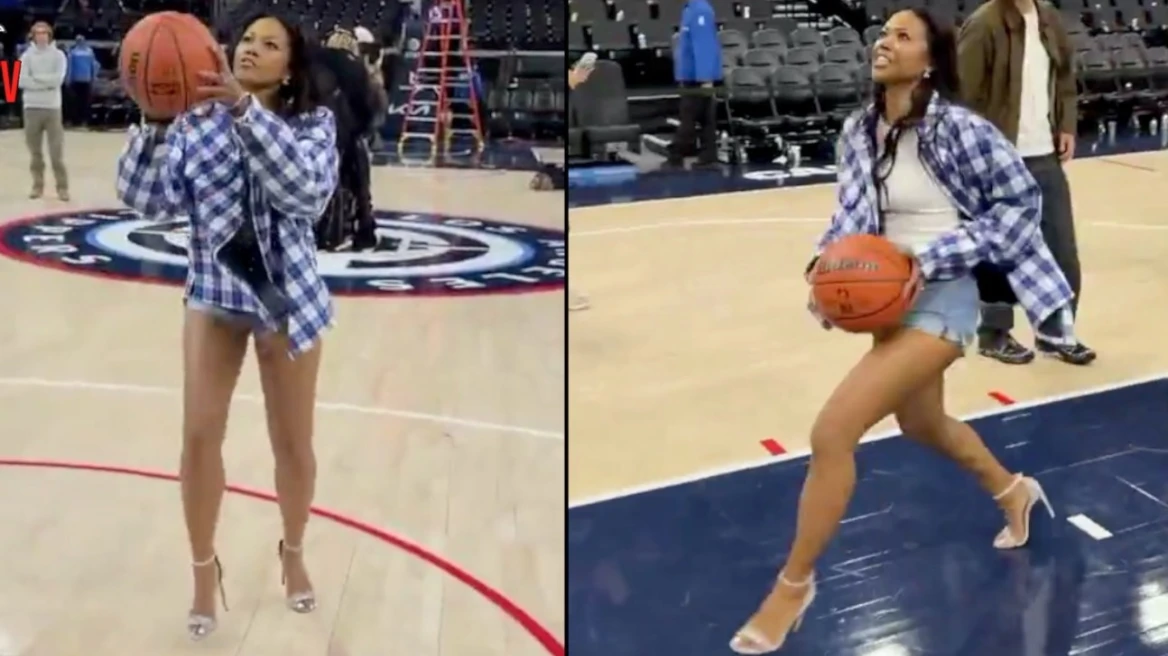 Οι διοργανωτές όμως της επιφύλασσαν μία έκπληξη, αφού την έβαλαν μέσα στο γήπεδο σε ένα τάιμ άουτ και έριξε μερικά σουτάκια πάνω στα ψηλά της τακούνια.