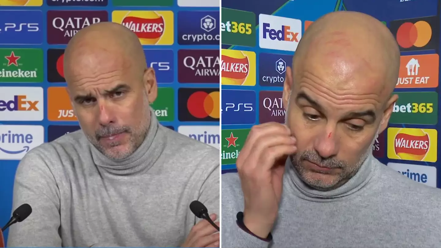 Ο Καταλανός τεχνικός Πεπ Γκουαρδιόλα στην συνέντευξη Τύπου μετά την αναμέτρηση της Μάντσεστερ Σίτι απέναντι στη Φέγενορντ, εμφανίστηκε με σημάδια στο πρόσωπο.