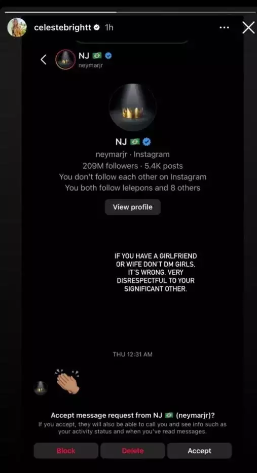 Ο Νεϊμάρ φαίνεται πως επιχείρησε να επικοινωνήσει με μηνύματα με την Σελέστ Μπράιτ, με το πανέμορφο μοντέλο -όμως- να βάζει… στη θέση του τον Βραζιλιάνο επιθετικό.