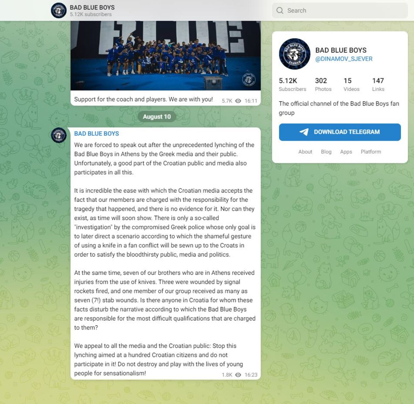 «Αναγκαζόμαστε να μιλήσουμε μετά το πρωτοφανές λιντσάρισμα των Bad Blue Boys στην Αθήνα από τα ελληνικά ΜΜΕ και το κοινό τους. Δυστυχώς σε όλα αυτά συμμετέχει και ένα μεγάλο μέρος του κροατικού κοινού και των ΜΜΕ.
