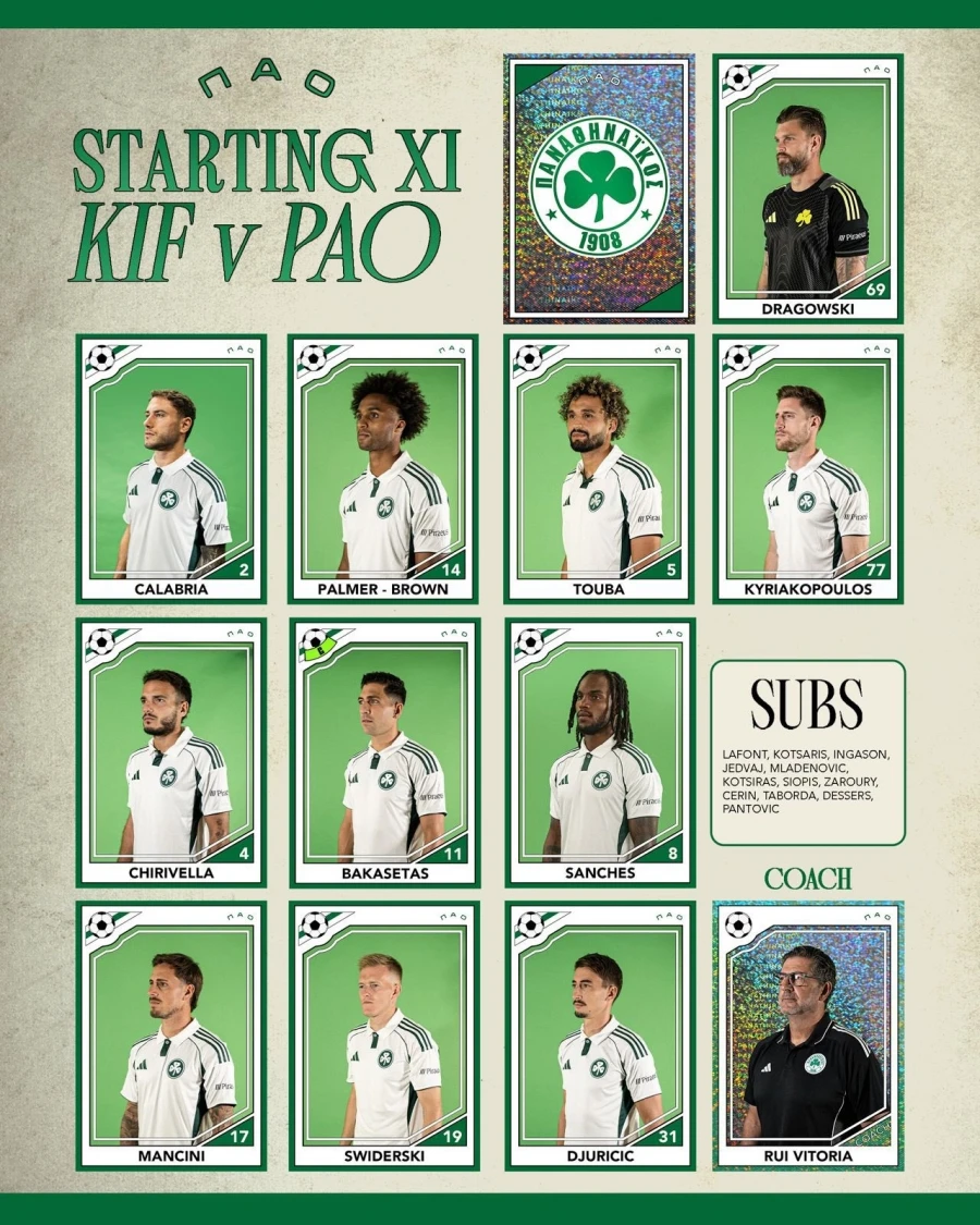 Κάτω απ’ τα δοκάρια ο Ντραγκόφσκι. Καλάμπρια και Κυριακόπουλος στα άκρα της άμυνας, με τους Πάλμερ-Μπράουν και Τουμπά στα στόπερ.