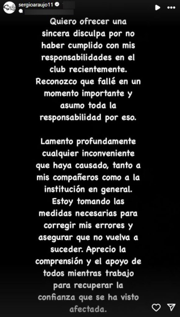 Ο Αραούχο προχώρησε σε ένα story στον προσωπικό του λογαριασμό στο Instagram, με το οποίο ζητά συγγνώμη για τη συμπεριφορά του.
