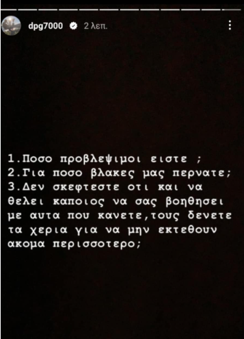 Ενώ σε ένα δεύτερο story, έριξε τις σπόντες του για την διοίκηση του Ολυμπιακού και τους αδερφούς Αγγελόπουλους, γράφοντας τα εξής: