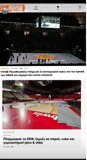 Ο εκκεντρικός ιδιοκτήτης του Παναθηναϊκού – AKTOR Δημήτρης Γιαννακόπουλος, προχώρησε σήμερα (26/12) σε δύο αναρτήσεις στο instagram, με αφορμή τις πρόσφατες τραγικές εικόνες από το κλειστό γήπεδο της ομάδας μπάσκετ του Ολυμπιακού, όπου στάζουν νερά μέσα στο ΣΕΦ.