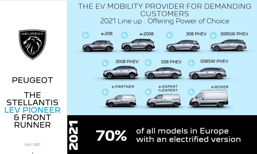Σύμφωνα με τους Γάλλους μέχρι το 2023, το 85% των μοντέλων της μάρκας θα είναι εξηλεκτρισμένα. Μέχρι το 2025 το ποσοστό των εξηλεκτρισμένων στην Ευρώπη ,θα φθάσει το 100% των αυτοκινήτων. Τους πρώτους πέντε μήνες του 2021, τα PEUGEOT e-208 και e-2008 βρίσκονται στη 2η θέση στα αντίστοιχα BEV segments.