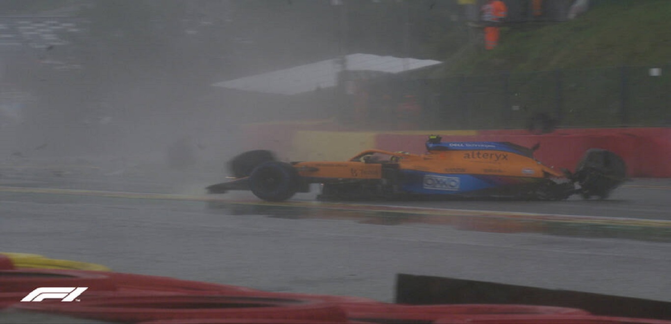 Ο 21χρονος οδηγός χτύπησε στον τοίχο στη γωνία του Eau Rouge κι ευτυχώς δεν τραυματίστηκε σοβαρά. Πλήρωσε τις τραγικές καιρικές συνθήκες στο Βέλγιο. Ο Νόρις, ο οποίος ήταν ο ταχύτερος στους δύο πρώτους γύρους, εξετάστηκε από τους γιατρούς και μπόρεσε να βγει από το αυτοκίνητο με δικές του προσπάθειες. Ευτυχώς είναι σε καλή κατάσταση.