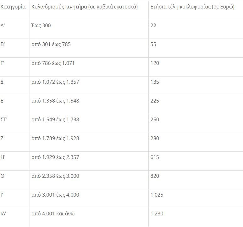 «ιβ) Για τα επιβατικά ιδιωτικής χρήσης οχήματα της δασμολογικής κλάσης Σ.Ο. 87.03, τα οποία έχουν λάβει έγκριση Μεμονωμένου Οχήματος Ιδιαίτερης Κατασκευής (Μ.Ο.Ι.Κ.) σύμφωνα με την υπ’ αρ. 33692/2202/2014 (Β’ 3134) απόφαση του Υπουργού Υποδομών και Μεταφορών και ταξινομούνται ως «οχήματα μεταχειρισμένων εξαρτημάτων», ανεξαρτήτως της ημερομηνίας της πρώτης ταξινόμησής του σε κράτος μέλος της Ε.Ε. ή χώρα του Ε.Ο.Χ., τα τέλη κυκλοφορίας υπολογίζονται αποκλειστικά με βάση τον κυλίνδρισμά του κινητήρα αυτών κατ’ αναλογία με τον πρώτο πίνακα της υποπερ. α’, ως εξής: