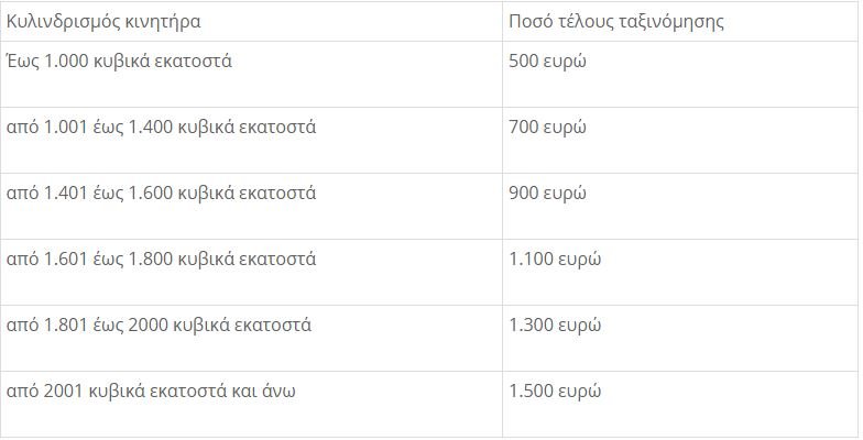 1.α. Θεσπίζεται η επιβολή τέλους ταξινόμησης, αναλόγως του κυλινδρισμού του κινητήρα τους, για τα επιβατικά αυτοκίνητα της δασμολογικής κλάσης Συνδυασμένης Ονοματολογίας (Σ.Ο.) 87.03, τα οποία έχουν λάβει έγκριση Μεμονωμένου Οχήματος Ιδιαίτερης Κατασκευής (Μ.Ο.Ι.Κ.) σύμφωνα με την υπ’ αρ. 33692/2202/2014 απόφαση του Υπουργού Υποδομών και Μεταφορών και ταξινομούνται ως «οχήματα μεταχειρισμένων εξαρτημάτων».