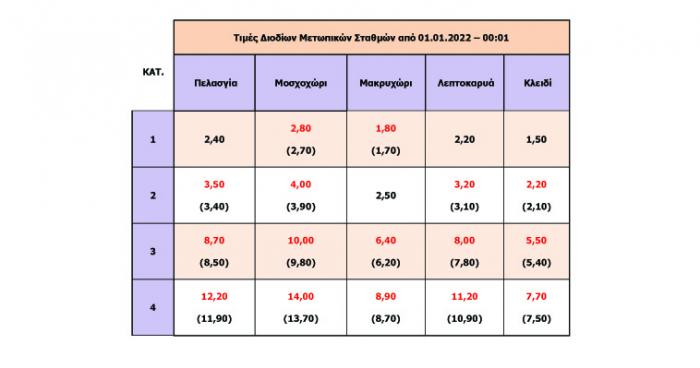 Με κόκκινο χρώμα είναι οι νέες τιμές του 2022.