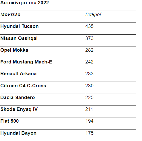 Ενδεικτικό των αλλαγών που συντελούνται στο χώρο του αυτοκινήτου είναι το γεγονός ότι από το φετινό Top-10 τρία μοντέλα (Fiat 500, Ford Mustang Mach-E και Skoda Enyaq IV) είναι πλήρως ηλεκτρικά οχήματα μπαταρίας, ενώ δύο ακόμα μοντέλα είναι διαθέσιμα και σε συμβατικές και σε πλήρως ηλεκτρική έκδοση (Citroen ë-C4 Electic & Opel Mokka e)