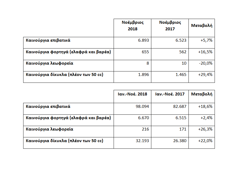 Συνολικά, στο ενδεκάμηνο Ιανουαρίου-Νοεμβρίου 2018 οι ταξινομήσεις καινούργιων επιβατικών είναι αυξημένες κατά +18,6% ως προς το αντίστοιχο διάστημα του 2017.