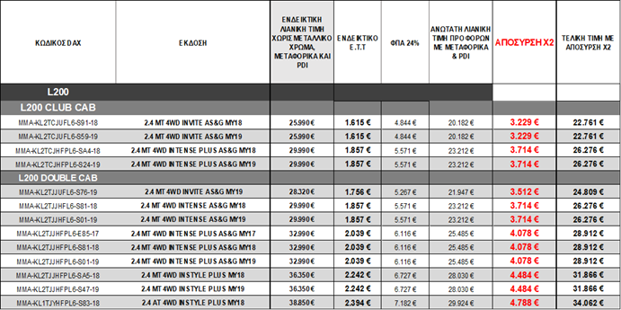 Για το Mitsubishi L200 ισχύει το πρόγραμμα ΑΠΟΣΥΡΣΗ Χ 2 με όφελος για τον πελάτη τη Διπλή Ολική απαλλαγή από το Φόρο Τελών Ταξινόμησης.