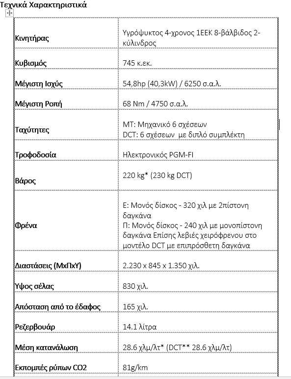 *Κυβισμός: 745 cc * Ιπποδύναμη: 55 ίπποι, στις 6.250 rpm * Τελική: 180 km/h *Βάρος: 230 Kg (γεμάτη) * Τιμή: 9.550 ευρώ