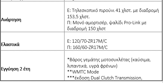 Στο μπροστινό τμήμα έχουμε νέα διπλή δαγκάνα με μονό δίσκο διαμέτρου 320mm και πίσω ακόμα έναν μονό δίσκο διαμέτρου 240mm που συμβάλουν στο σύστημα πέδησης των 17inch τροχών μπρος – πίσω με τα ελαστικά να διαφέρουν σε διαστάσεις 120/70 και 160/60 αντίστοιχα.