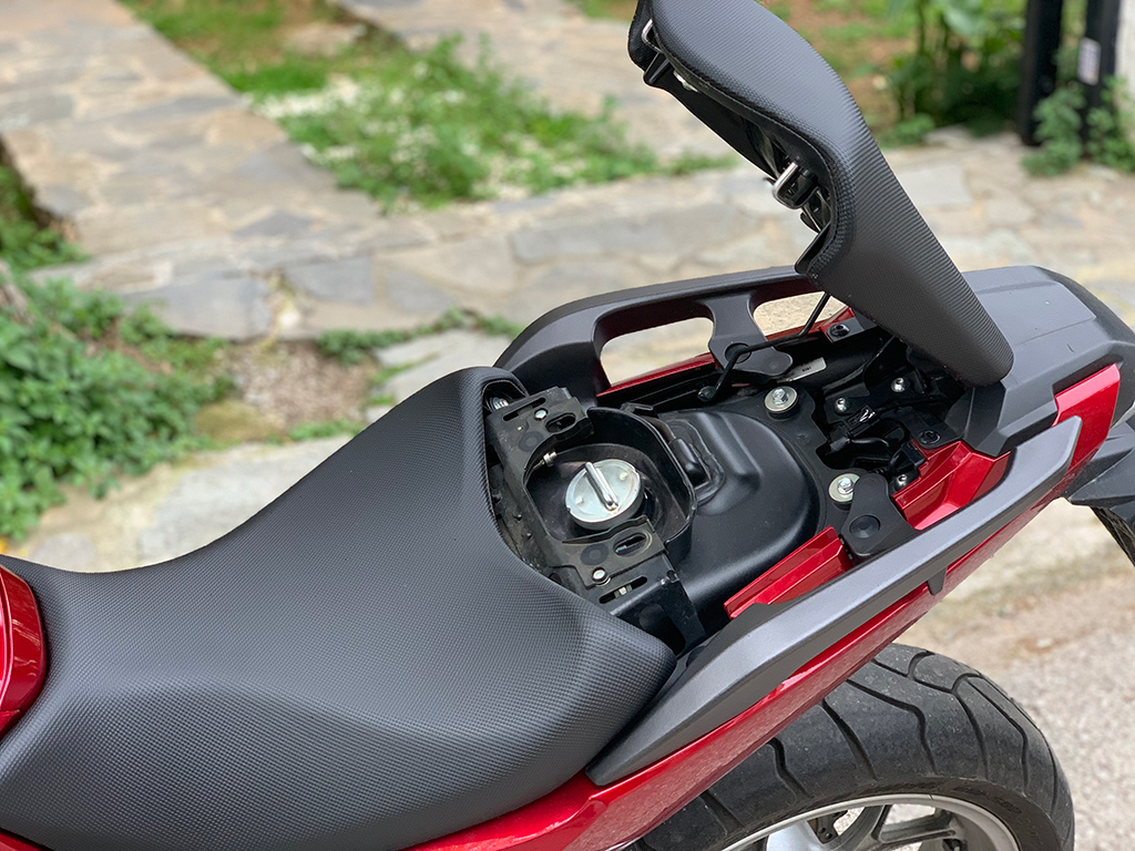Εμφανή στοιχεία της κληρονομιάς, από το σόι του «scooter» είναι ο αποθηκευτικός χώρος στο μπροστά τμήμα της μοτοσυκλέτας, εκεί που είθισται να βρίσκεται το ρεζερβουάρ. Μεγάλη ευκολία – οι κάτοχοι μηχανής θα με καταλάβουν – με 22 λίτρα χωρητικότητα, ικανό να αποθηκεύσει ένα full face κράνος.