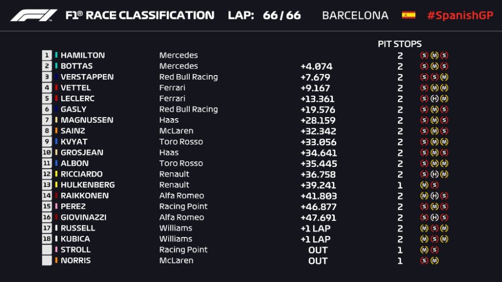 O Hamilton πήρε τη νίκη #76 της καριέρας του που ήταν παράλληλα η τέταρτη στη Βαρκελώνη και μάλιστα τρίτη συνεχόμενη! Μάλιστα, σημείωσε για πρώτη φορά φέτος και τον ταχύτερο γύρο, πράγμα που του χάρισε έναν επιπλέον πόντο.