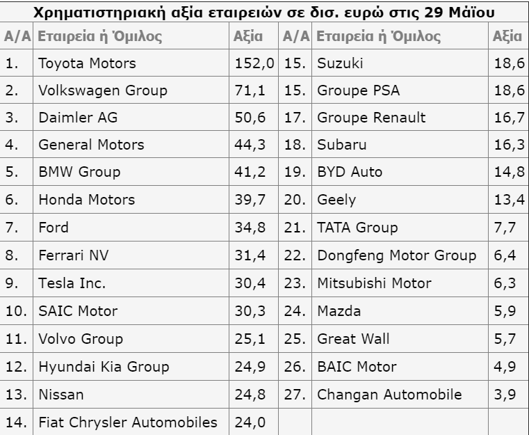 Οι συγχωνεύσεις και οι συνέργειες στην αυτοκινητοβιομηχανία δίνουν και παίρνουν για την αντιμετώπιση ενός όλο και πιο δύσκολου περιβάλλοντος. Ας δούμε λοιπόν τι αξίζει κάθε εταιρία με χρηματιστηριακούς όρους.