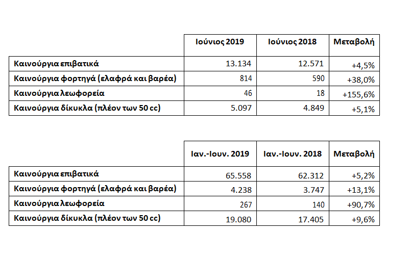 Συνολικά, στο εξάμηνο Ιανουαρίου-Ιουνίου 2019 οι ταξινομήσεις καινούργιων επιβατικών είναι αυξημένες κατά +5,2% ως προς το αντίστοιχο διάστημα του 2018.