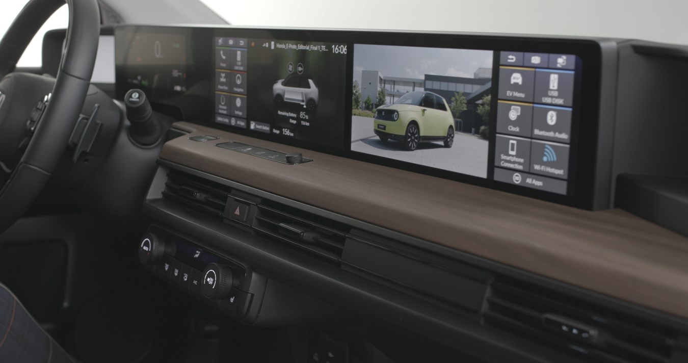Το μεγαλύτερο τμήμα του ψηφιακού ταμπλό πλήρους πλάτους της Honda e καταλαμβάνουν δύο οθόνες αφής LCD 12,3”. Αυτές είναι οι πρωταρχικές οθόνες infotainment, που προβάλλουν μία σειρά έξυπνων υπηρεσιών και εφαρμογών. Η προηγμένη διεπαφή είναι διαισθητική, εξατομικεύσιμη και έχει σχεδιαστεί για μέγιστη χρηστικότητα που προάγει το αυτοκίνητο σε κάτι παραπάνω από απλό μέσο μεταφοράς, ενσωματώνοντας το πλήρως στη συνδεδεμένη ζωή του ιδιοκτήτη του.