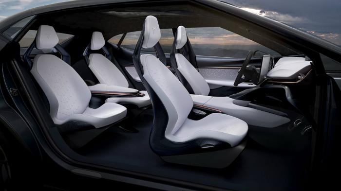 Οι σμιλεμένες εξωτερικές γραμμές του Concept αντικατοπτρίζονται στο εσωτερικό του. Ένας χώρος που αναμιγνύει υλικά και τεχνολογικές ιδέες και εστιάζει στη δημιουργία καμπίνας που προσφέρει τέλεια ισορροπία μεταξύ του προσανατολισμού του οδηγού και της άνεσης των επιβατών.