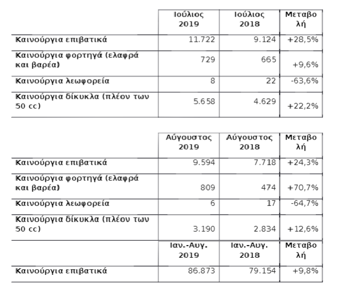 Αυξημένες κατά +28,5% και +24,3% ήταν οι ταξινομήσεις καινούργιων επιβατικών τους μήνες Ιούλιο και Αύγουστο 2019. Οι διαφορές είναι σε σύγκριση με τις πωλήσεις που έγιναν τους αντίστοιχους μήνες του 2018.