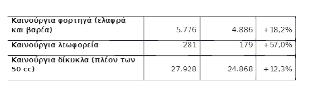 Στα καινούργια φορτηγά παρατηρείται αύξηση (+18,2%) από τις αρχές του έτους, ως προς την ίδια περίοδο πέρυσι, ενώ και στα καινούργια δίκυκλα (πλέον των 50 cc) οι ταξινομήσεις υπήρξαν αυξημένες κατά +12,3% ως προς το 2018.
