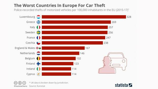 Σύμφωνα με τα στοιχεία που δημοσιοποίησε η Eurostat, στην Ελλάδα καταγράφονται 269 κλοπές ανά 100.000 κατοίκους, με το Λουξεμβούργο να κατέχει την πρώτη θέση με 328 κλοπές. Την πεντάδα συμπληρώνουν η Ιταλία, η Σουηδία και η Γαλλία.