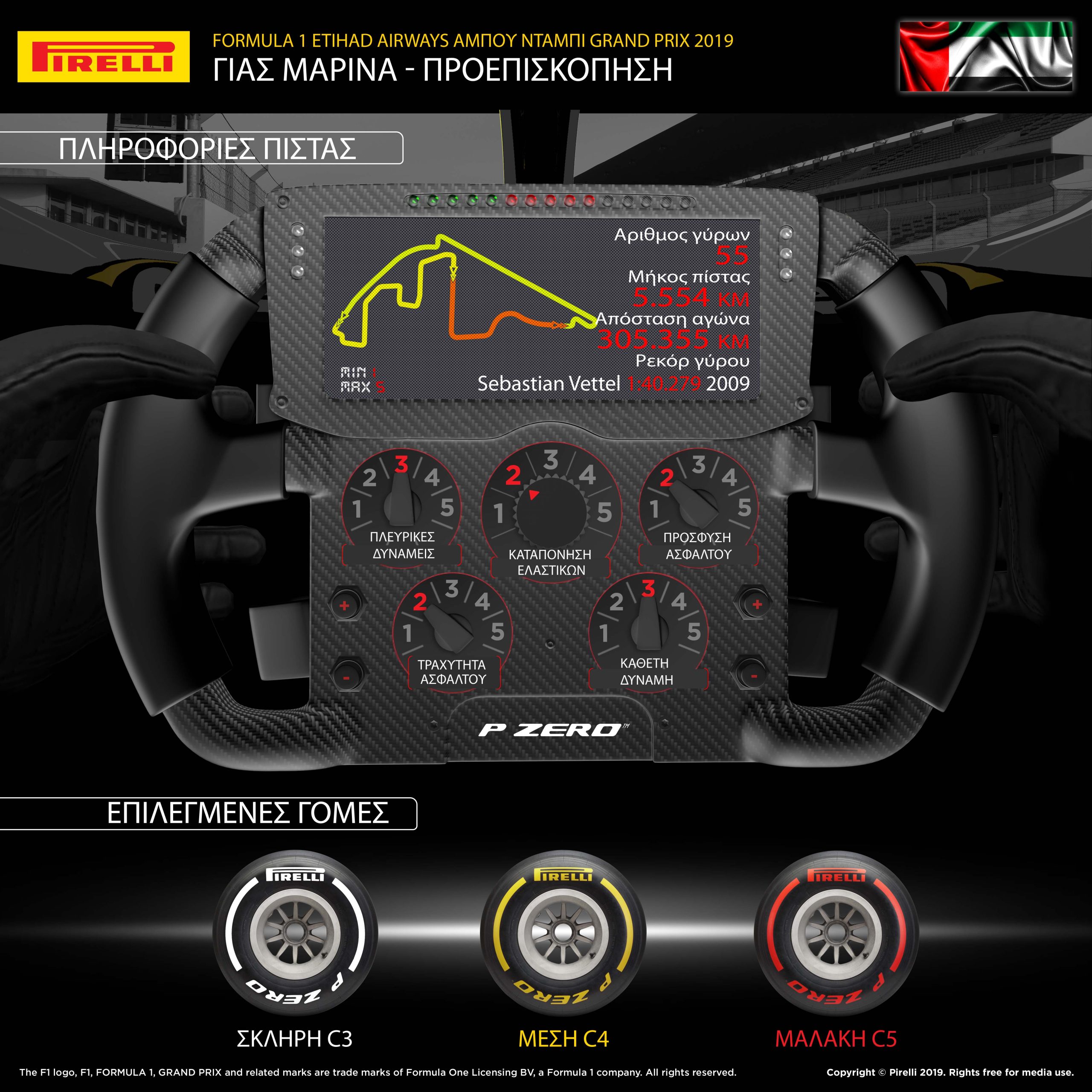 Για την ιστορία πρέπει να ξέρετε ότι η «Γιας Μαρίνα» βρίσκεται στο μέσο όρο της σεζόν όσον αφορά στην τραχύτητα. Έχει λεία άσφαλτο και ένα καλά ισορροπημένο μείγμα στροφών. Απαιτεί ελκτική πρόσφυση και σταθερότητα στο φρενάρισμα ενώ τα πλευρικά φορτία είναι μικρά. Παραδοσιακά στο Grand Prix του Άμπου Ντάμπι βλέπουμε στρατηγική μιας αλλαγής ελαστικών που παρουσιάζουν χαμηλή φθορά και πτώση απόδοσης λόγω υπερθέρμανσης. Όλα δείχνουν ότι αυτό θα γίνει και φέτος.
